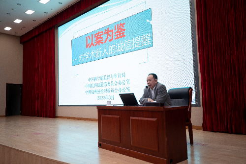 杨卫平作了题为“以案为鉴——对学术新人的诚信提醒”的案例警示教育报告,从学术失信的严重后果、科研不端行为高压线、同学们身边的案例、应树立的价值观和需要建立的方法论等五个方面对研究生和青年科研人员进行诚信提醒,希望同学们在科研学习过程中注意学术安全,走实职业生涯的第一个脚步,系好学术人生的“第一粒扣子”。与会同学结合自身实际与杨主任进行了热烈的互动交流。