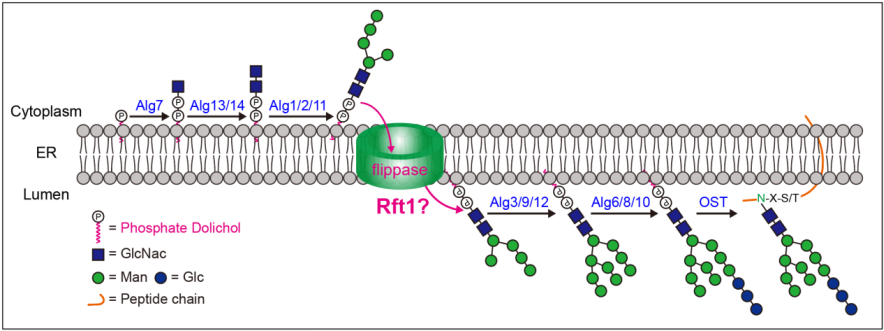 M5GN2-PP-Dol的翻转是糖基化能否实现的重要环节,翻转酶可用于蛋白糖基化修饰的工具。人体内糖基化修饰过程中,相关基因突变会引起先天性糖基化障碍(CDG)等糖基化代谢异常的相关疾病,严重威胁人体健康,其中因Rft1基因突变导致的Rft1-CDG疾病的发病机制尚未探明。明确Rft1蛋白的功能和作用机制,将为相关CDG疾病的诊断和靶向治疗提供理论基础。目前,因缺少广泛认可的Rft1活性检测手段,导致Rft1是否为真核细胞M5GN2-PP-Dol翻转酶的争议已持续多年。