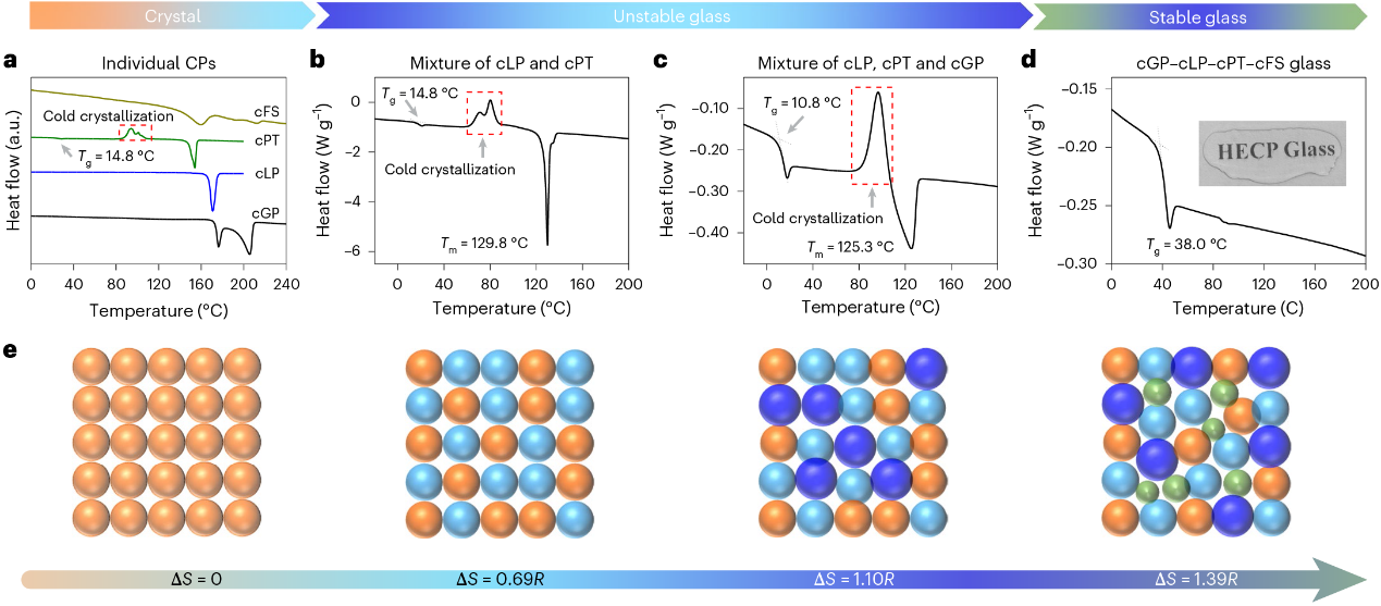 为此,研究团队采用高熵策略,首次实现了基于非共价作用的环肽玻璃的创制。通过熔融多种环肽创造高熵环境,利用淬火技术保持过冷液体中的多尺度分布的无序构象,有效抑制其结晶,最终促进了玻璃的形成。这一原理,同样适用于制备其他有机小分子的高熵非共价玻璃。 HECP玻璃抗结晶性、机械性能和酶耐受性的提升得益于玻璃中分子扩散的减缓和网络连接性的增强。通过对成分的精确调控,可以实现对这些性能的有效调节,这也为环肽药物的可控释放提供了新的可能。此外,HECP玻璃还显示出其整合染料和纳米颗粒等其他功能基团的潜力,为多功能可持续非共价玻璃的设计和开发提供了方案。该成果目前处于实验室研究阶段,值得进一步深入研究和探索。