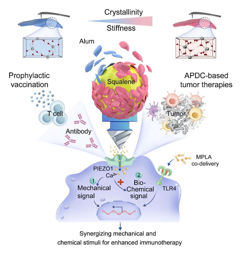 针对这一难题,研究团队通过调控铝盐的晶体结构,将其从传统颗粒转化为稳定于油/水界面的Pickering乳滴外壳(ASPE),构建了“可变形的三维机械界面”。发生形变的乳滴像“气垫”一样贴附在DC表面,增大了与细胞膜的接触面积,有效增强机械刺激信号。调控后的晶体结构,可精准控制界面刚度,晶型越高,界面越“硬”,对细胞施加的机械应力越显著。研究人员发现,强机械刺激可直接激活PIEZO1受体,进而引发Ca2+流入信号链放大,并显著促进抗原交叉递呈。这意味着,佐剂不再只是“携带刺激物的载体”,而成为了主动调控免疫细胞行为的机械工具。