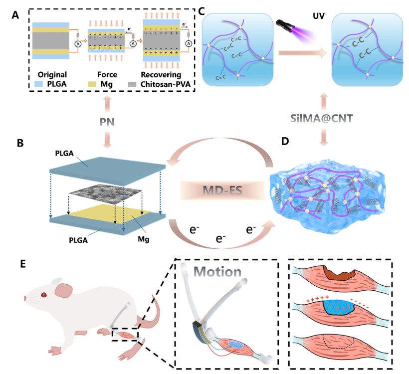 骨骼肌约占人体体重的40-50%,是维持日常活动与运动功能的重要组织,但当发生严重缺损,特别是大体积肌肉缺损(VML,通常指缺失超过20%的肌肉量)时,靠机体自身修复往往难以实现有效再生,进而导致肌力下降、活动受限乃至长期功能障碍。目前临床常用的自体肌肉移植与康复训练等策略仍面临供体不足、匹配困难与恢复周期长等局限。电刺激疗法因可模拟生物电并促进修复而受到关注。然而,传统电刺激方式往往依赖体外供能,植入电极操作不便、舒适性不足,且植入式电刺激器件体积庞大,这些限制了其长期、稳定应用,同时也增加了患者负担。
