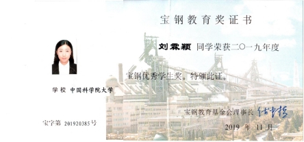 2019年度宝钢教育奖评审结果于近日公布,经评审,过程工程所刘霖颖同学获得2019年度宝钢优秀学生奖。