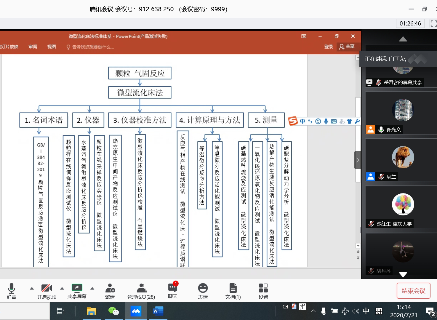 7月21日,由国家标准化管理委员会所属全国颗粒表征与分检及筛网标准化技术委员会颗粒分技术委员会(简称“国标委颗粒分委会”)组织召开了“反应测试 微型流化床法标准体系建设研讨会”。会议由国标委颗粒分委会秘书处及沈阳化工大学承办,沈阳化工大学校长许光文教授主持。来自清华大学、浙江大学、哈尔滨工业大学等单位的30余名相关领域知名学者及专家通过线上参会。过程工程所作为国家标准《颗粒 气固反应测定 微型流化床法》(GB/T 38432-2019)的第一起草单位参加了此次会议,和与会专家共同研讨“反应测试 微型流化床法”标准体系的进一步建设及推进措施。