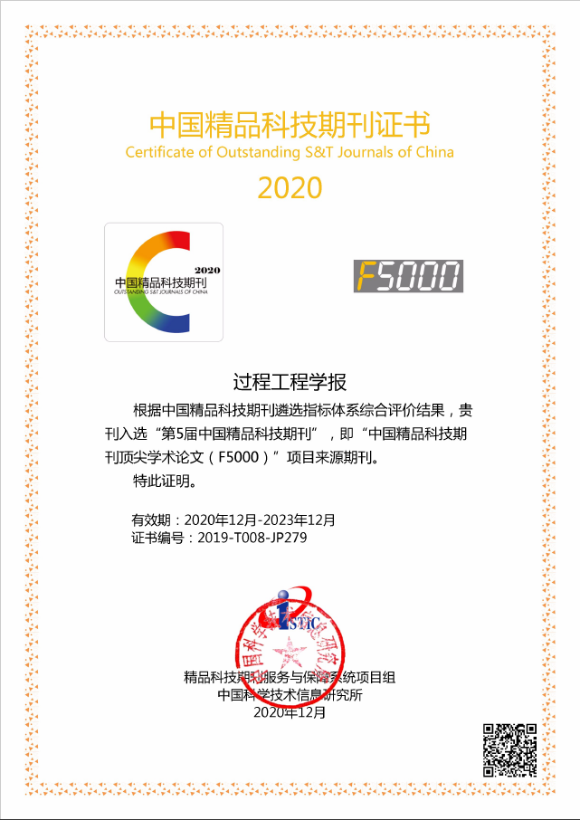 《过程工程学报》成功入选“第五届中国精品科技期刊”